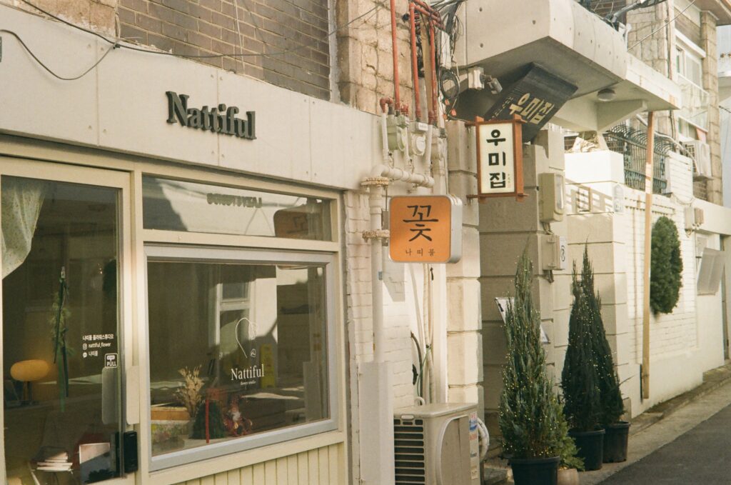 발길을 옮겨 마주한 ‘나띠풀(Nattiful)’ 꽃집 앞 풍경은 아날로그적 삶이 결코 과거에 머물러 있지 않음을 보여준다. 차가운 콘크리트 벽 사이에 놓인 초록빛 나무들과 ‘꽃’이라고 정직하게 쓰인 따뜻한 색감의 간판은 지나가는 이들의 시선을 잠시 멈추게 한다.